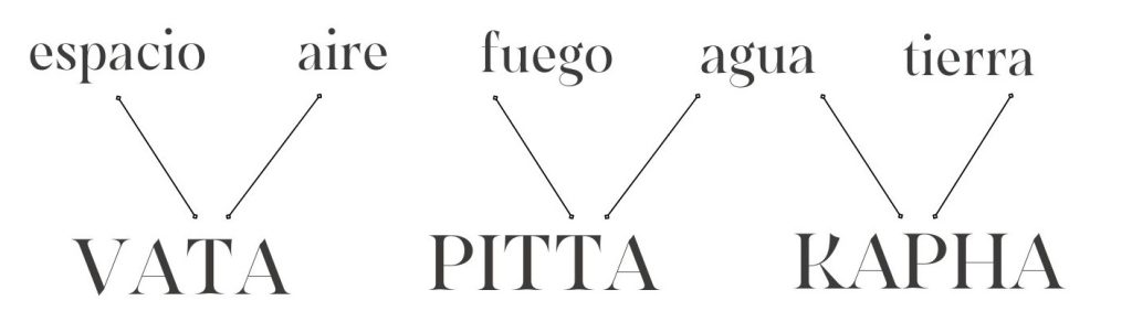 En Ayurveda, se constata que cada persona tiene un tipo de cuerpo único (o principio biológico) conocido como DOSHA , que se compone de diferentes elementos: Vata (aire y espacio), Pitta (fuego y agua) y Kapha (agua y tierra).